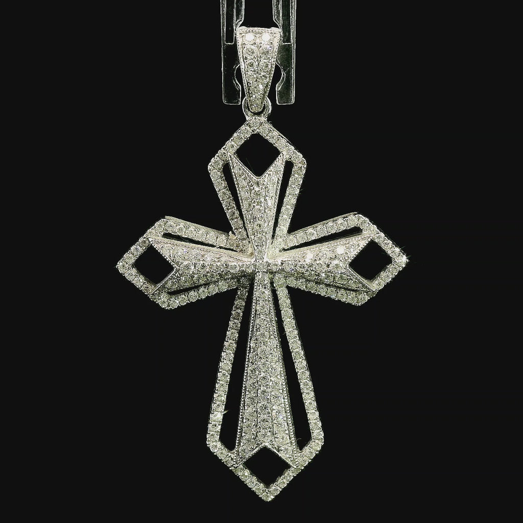 One ladies 18kt white gold diamond cross weighing 10.25 grams, containing 213 pave set full cut round natural diamonds weighing .82 cts, G color VS2 clarity.