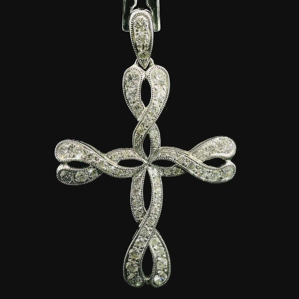 18kt white gold Fleur di Lis pendant weighing 4.17 grams, containing 56 full cut diamonds weighing .29 cts, F color VS1 clarity.