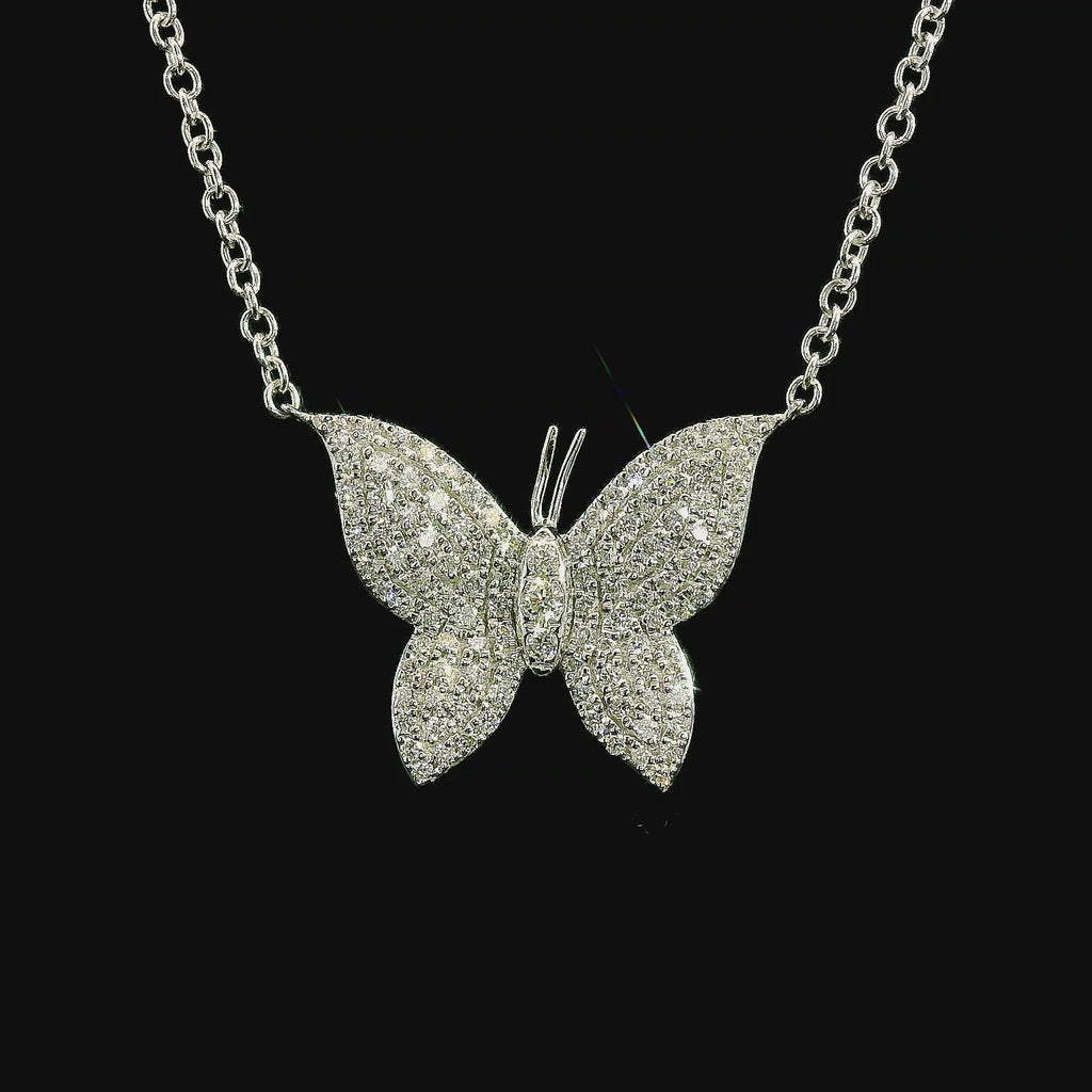 18kt white gold butterfly necklace weighing 4.27 grams containing 107 full cut natural diamonds weighing .36 cts, G color VS2 clarity.