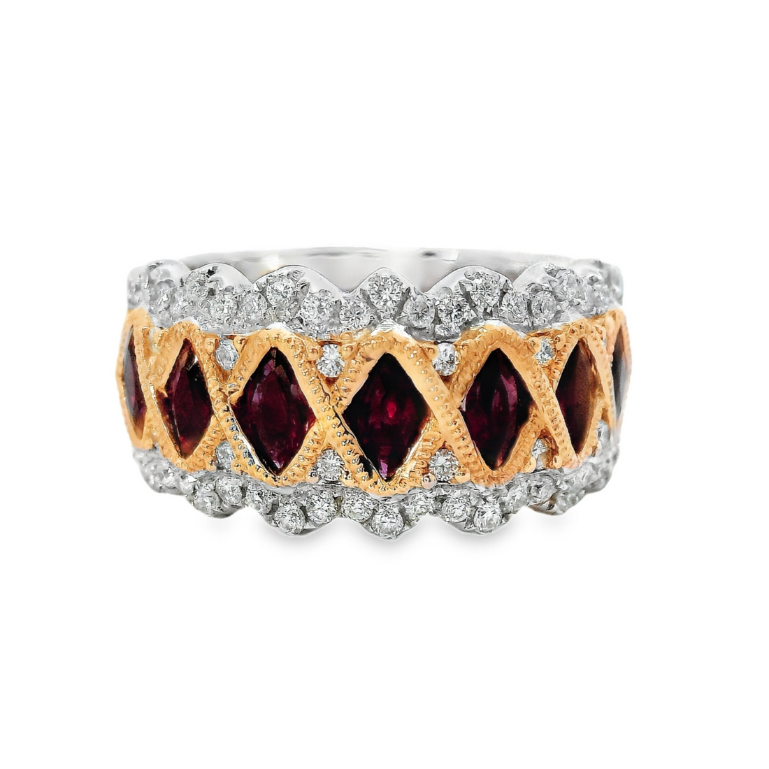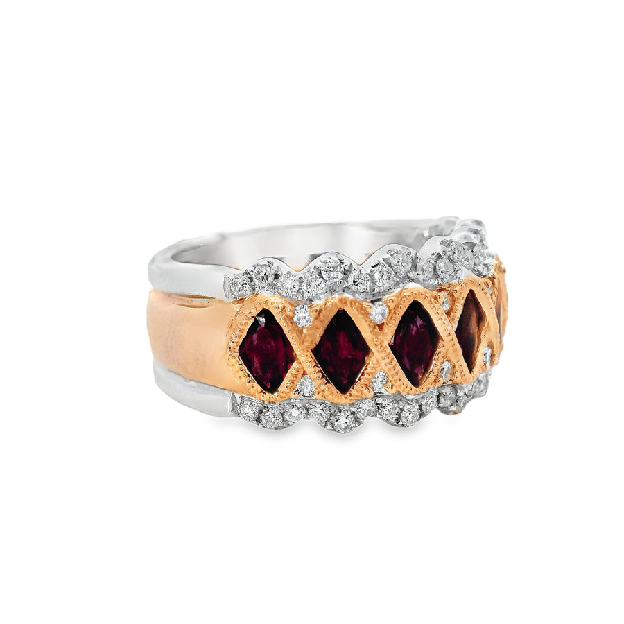 18kt two tone white and rose gold ring weighing 12.1 grams containing 54 full cut natural diamonds weighing .40 cts, G color VS2 clarity and seven marquise shaped natural tourmalines weighing 1.08 cts.