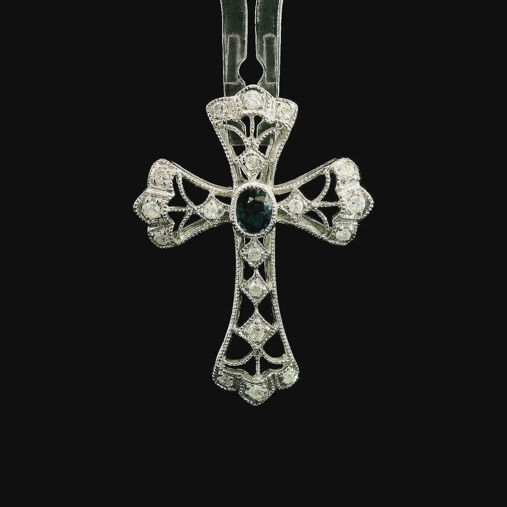 One ladies 18kt white gold diamond and sapphire filgree cross containing 18 full cut natural round diamonds weighing .20 cts, H color I1 clarity, and one natural oval shaped sapphire weighing .22 cts.