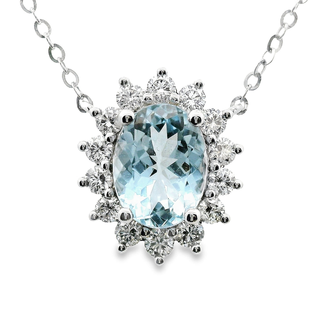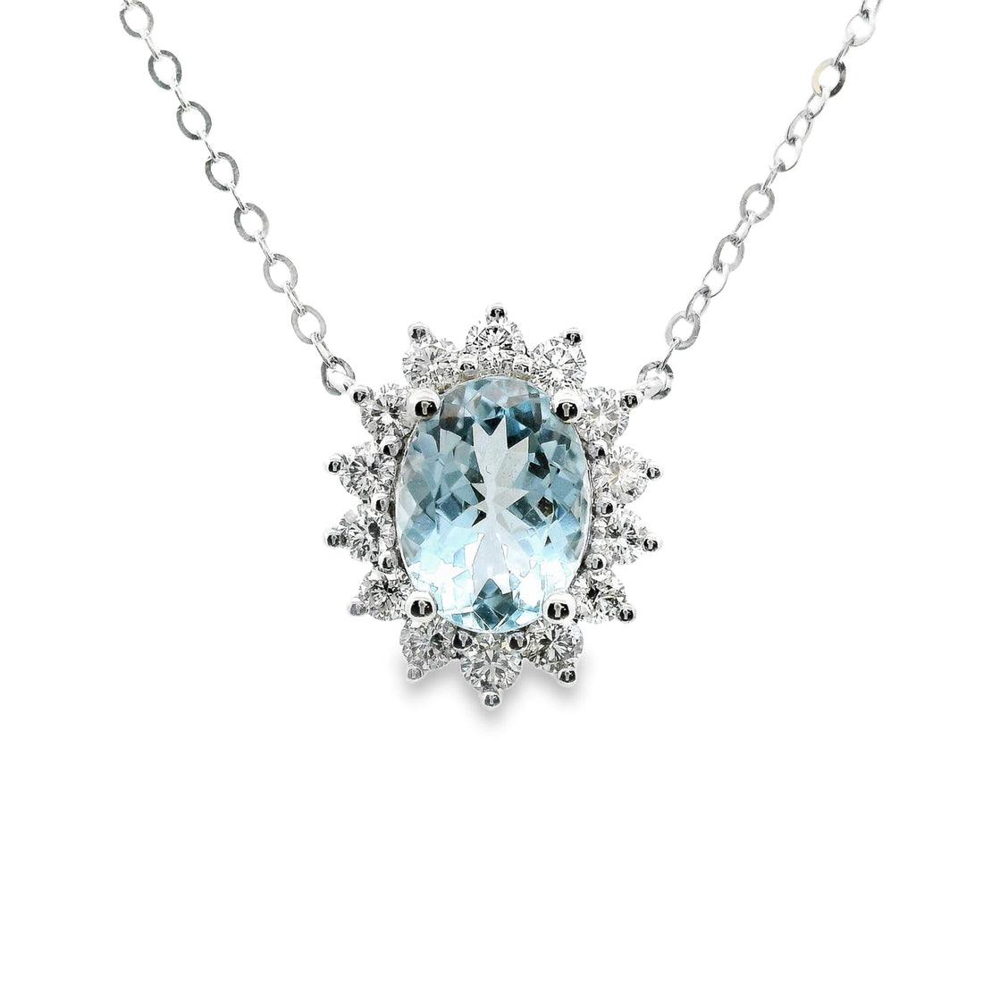 18kt white gold pendant weighing 3.19 grams containing one natural oval shaped aquamarine weighing 1.17 cts, and 18 full cut round natural diamonds weighing .48 cts, G color SI1 clarity.