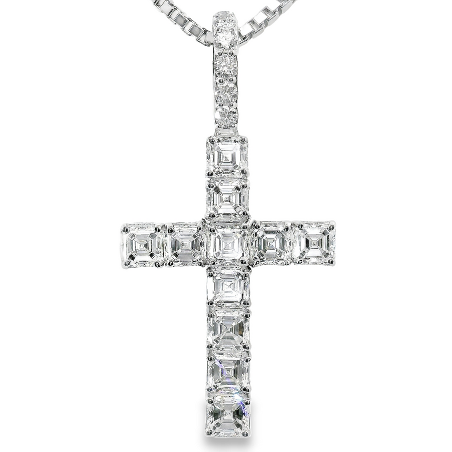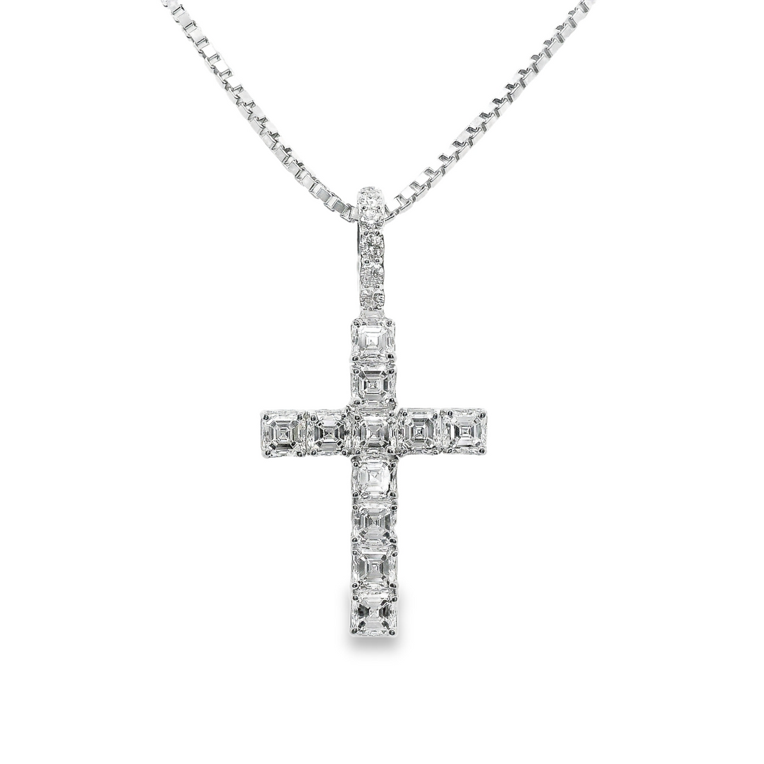 14kt White Gold Lab-Round Asscher and Round Cut Diamond Cross Pendant (2.93ct) on 14kt Italian Made Box Chain (8.49g)